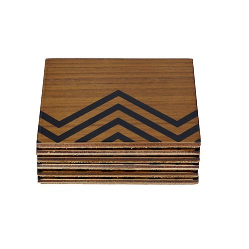 Set of 6 wooden coasters with an embracing chevron pattern resembling waves, characteristic of Japanese tenets of power and purity.